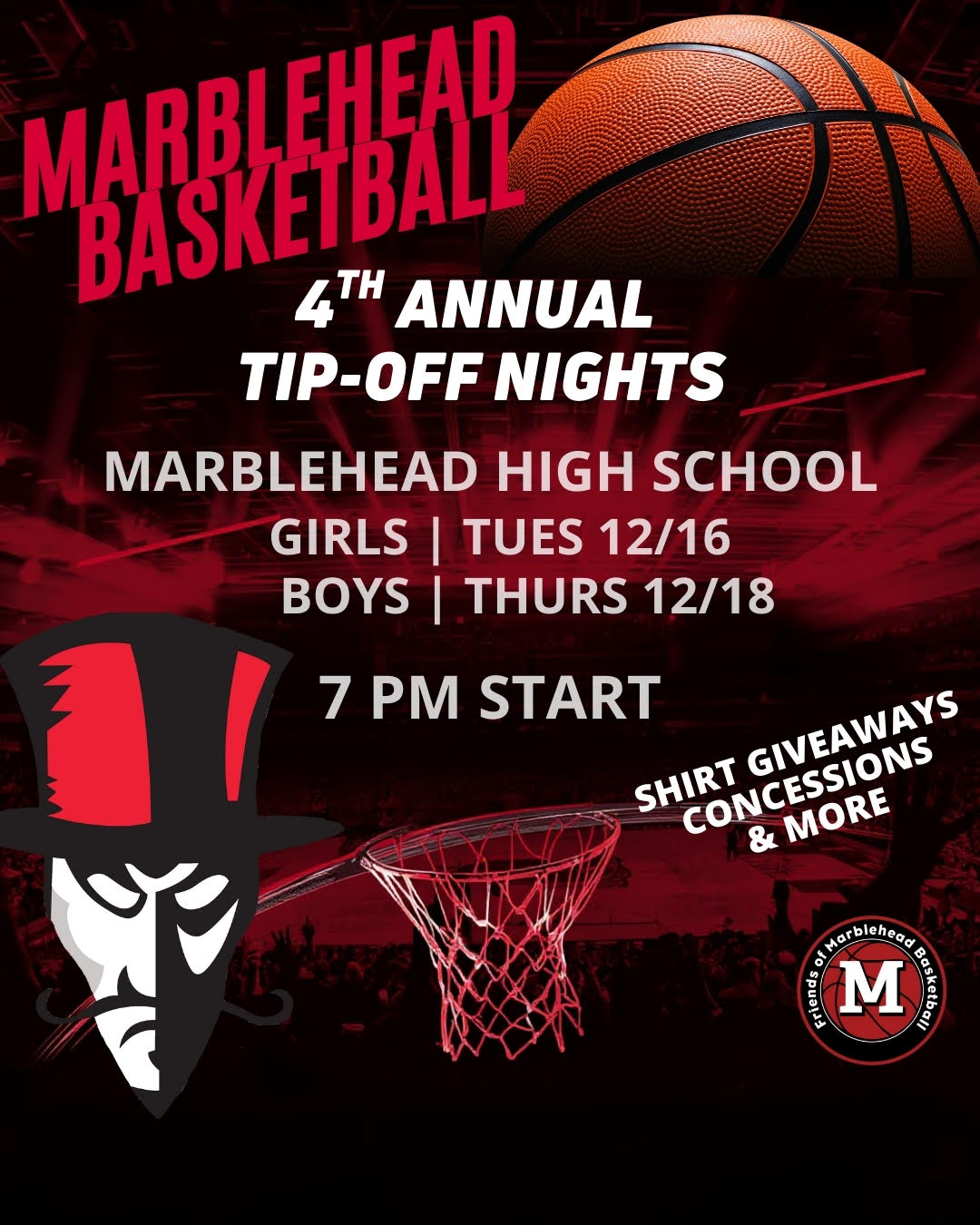 MARBLEHEAD – Friends of Marblehead Basketball is proud to announce the 4th Annual Tip-Off Nights, taking place on Tuesday, December 16 for the Girls program and Thursday, December 18 for the Boys program. Both events begin at 7:00 PM in the Marblehead High School Field House and will mark the first home game of the season for each team.