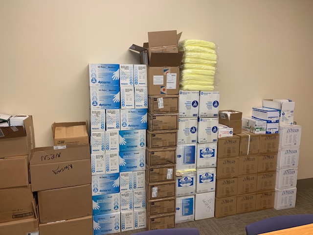 In recent weeks, Elisa Castillo, assistant dean of students for wellness, has led Salem State’s academic, facilities and health services departments in pooling together their Personal Protective Equipment (PPE) resources for external donation. This resulted in gathering nearly 34,000 gloves, over 1,100 gowns, 920 medical masks, 139 procedure masks with visors, 80 N95 face masks, 45 nasal cannula, 29 nasopharyngeal swab sets, and 300 shoe covers for distribution to medical institutions and local nonprofits that serve others in the region.