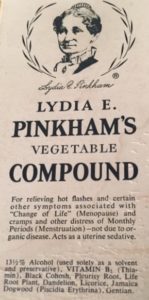 Lydia Pinkham made the pleasing tonic in her Lynn basement and distributed it, free of charge, to her friends and neighbors. It worked, so she went commercial, becoming the countryâs most famous woman in the late nineteenth century. A canny marketer, her herbal and alcohol-enhanced tonic reached women in all corners of a world market. Essences of unicorn root, life root, black cohosh, pleurisy root and fenugreek seed were supplemented with a generous splash of alcohol â 18 percent, in some cases. The medicinal potion was the subject of drinking songs in colleges everywhere.