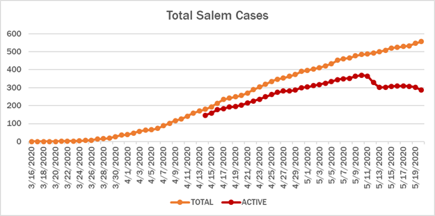 As of 4:00 p.m. on May 20, 2020, there are 557 Salem residents who have tested positive for novel coronavirus (COVID-19), of which 287 cases are currently active. 26 Salem residents have died from the virus. Since the outbreak began, 270 Salem residents who had been infected by the virus have cleared their isolation period. As of May 12, 2020, Salem’s case rate was 4.3% below the state case rate.