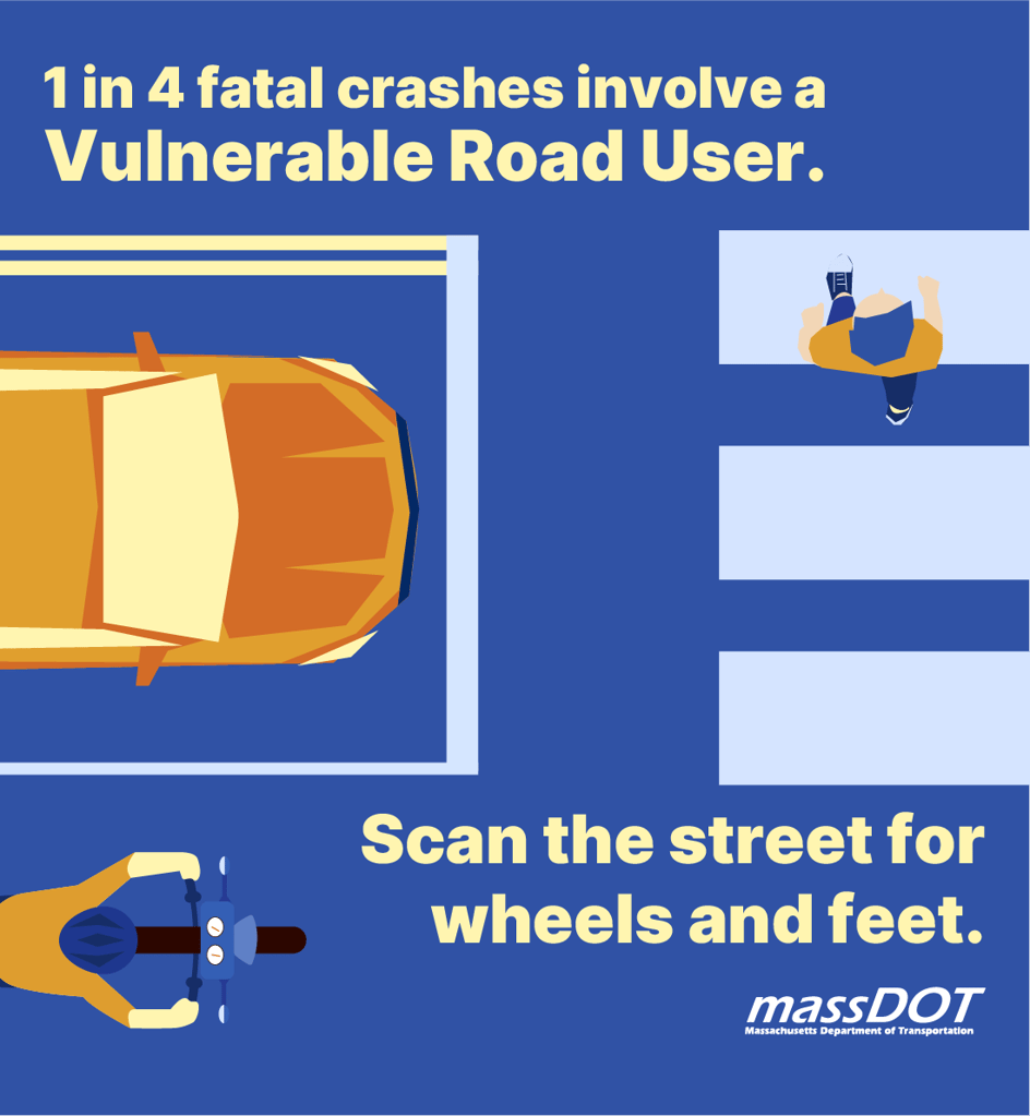 1 in 4 fatal crashes involve a vulnerable road user. Being attentive saves lives. Look all ways, look always.